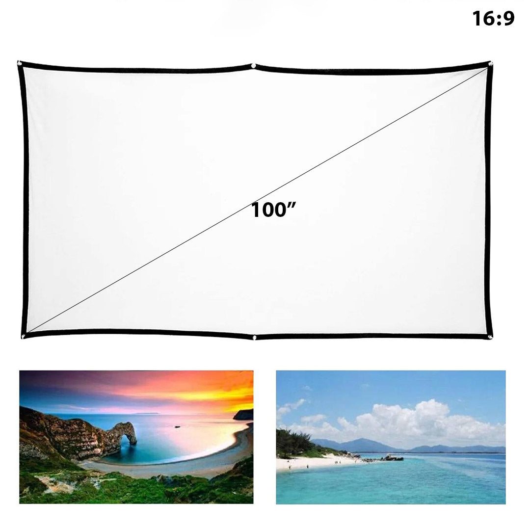 شاشة 100 بوصة عالية الدقة، مقاومة للتجاعيد، بتباين عالٍ. توفر انتشارًا متساويًا للضوء المسقط، مما يضمن تجربة بصرية مثالية. قابلة للطي وخفيفة الوزن لسهولة التخزين أو النقل.